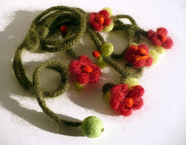 materiale occorrente: fettuccia di feltro rosso scuro,pannolenci rosa, rosa scuro, viola, verde, verde scuro e arancio, pom-pon di passamaneria arancio e bordeaux, puntini di feltro viola, cotone lanato rosso, ago e filo di cotone,ago da lana, forbici a lama diritta