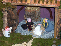 Prendete il cartoncino fucsia e ritagliate un rettangolo di 20cm per 8cm circa. Curvatelo e sovrapponete leggermente le due estremità, in modo da formare un cono, che bloccherete con dei punti metallici. Con la carta dorata per dolci, decoratene le due estremità di quello che sarà il mantello della Madonna. Colorate con la tempera rosa la pallina da ping pong, che costituirà la testa e, quando si sarà asciugata, incollatevi due o tre fili di lana gialla, facendo cadere le lunghezze ai lati come se fossero dei fluenti capelli biondi. Con del nastro adesivo, quindi, attaccatela al corpo precedentemente creato. Allo stesso modo procederete alla costruzione del vostro San Giuseppe, scegliendo per i capelli la lana marrone corta e la pallina color rosa, che incollerete al “mantello” a forma conoidale, questa volta di colore blu.